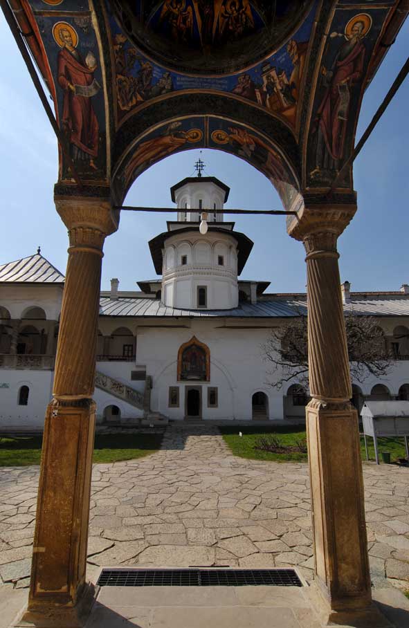Stolz erhebt sich der gewaltige Klosterkomplex in den Hügeln zwischen Râmnicu Vâlcea und Târgu Jiu. Auch hier beeindruckt die Apokalypse im Eingangsbereich mit seinem feuerspeienden Höllentier. Bedrohlich rollt es mit den Augen, bevor es die Seelen der armen Sünder verschlingt, die Teufel und Hilfsteufel mit Speeren in seinen Schlund stoßen. Von der Kuppel lächelt sanft eine goldgesäumte Gottesmutter mit Jesuskind, umgeben von den Sphären der Engelshierarchien.