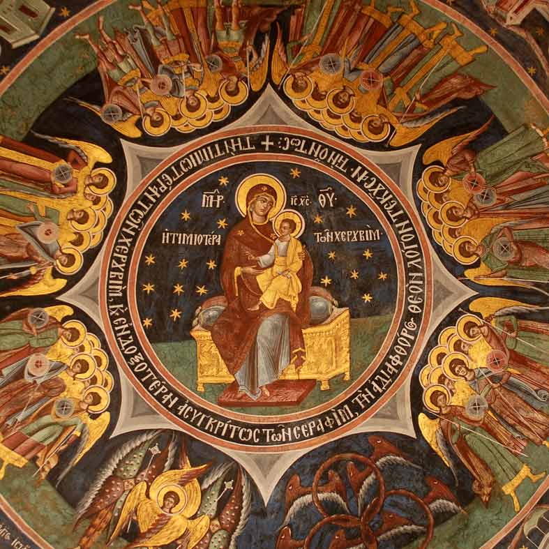 Suceviţa: Cherubim, Serafim und heilige Bilderflut auf türkisgrünem Grund. Wer genau hinsieht, entdeckt vielleicht noch eins der kleinen goldenen Sternchen, mit denen die Klosterfassade einst übersät war. Wie muss sie im gleißenden Sonnenlicht gefunkelt haben!