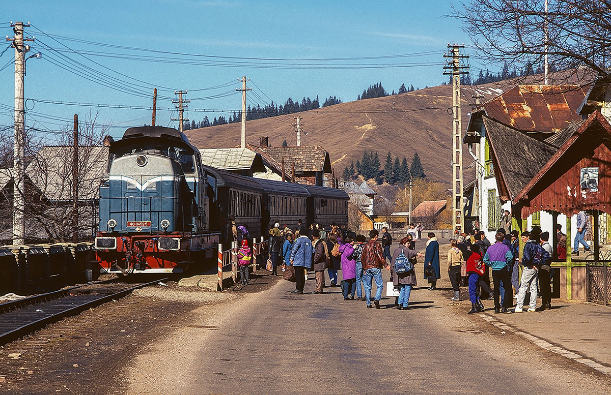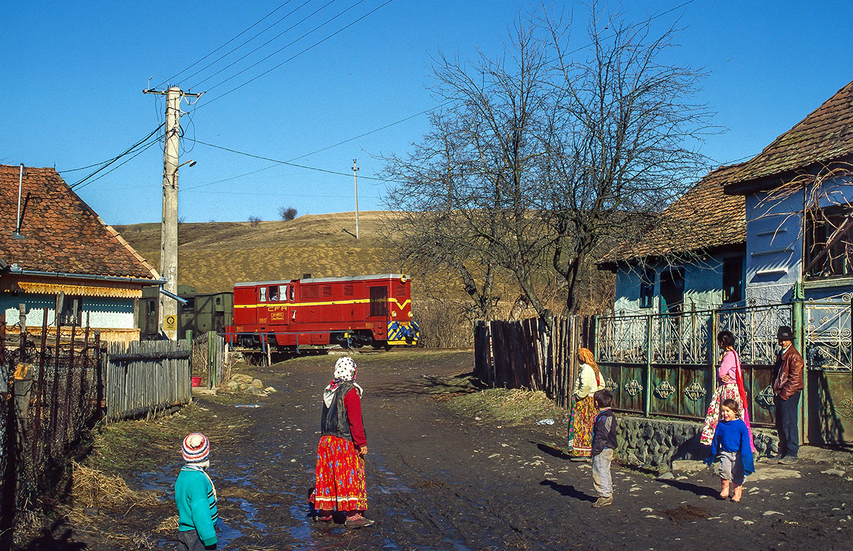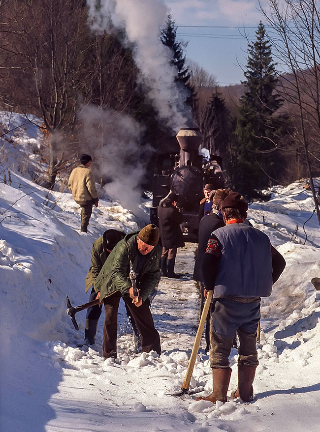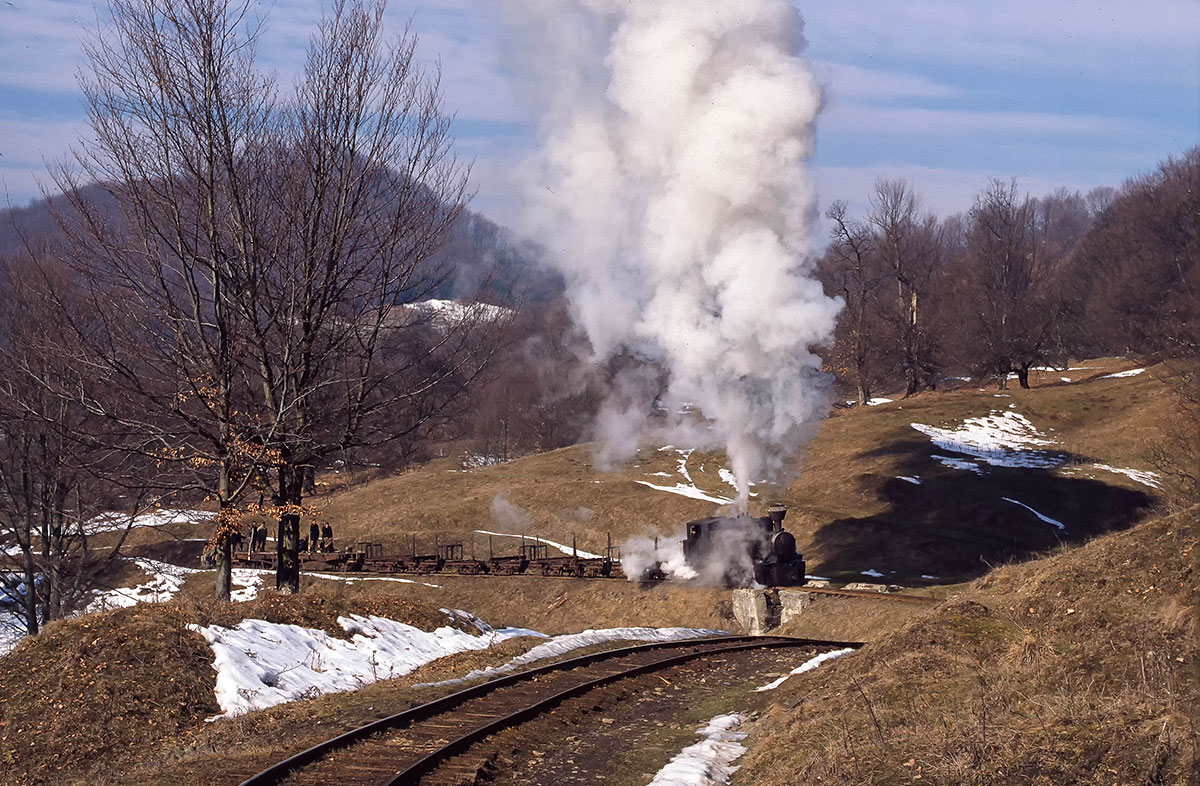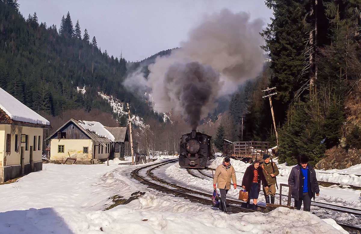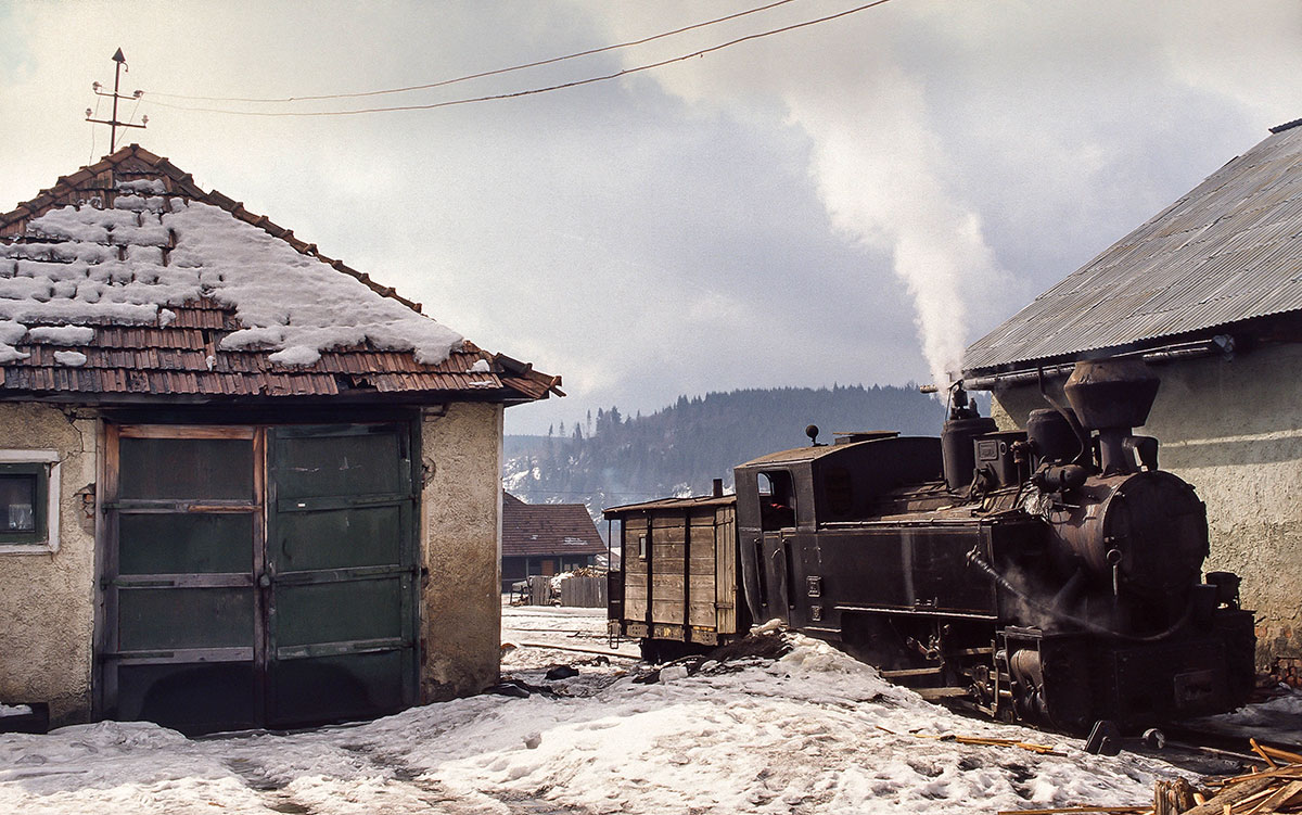 Band war Abzweigbahnhof. Auf dem Streckenast nach Miheşu de Câmpie entstand am 28. Februar 1997 diese Aufnahme.Angesichts der Offroadqualitäten der parallel zur Bahnlinie führenden Landstraße war ab diesem Punkt der Zug schneller als wir, so dass wir die Zugverfolgung abbrechen mussten (28.02.1997).Die Verschlafenheit auf dem Tihuța-Pass am 1. März 1997 ließ erahnen, wie es in den Alpen vor 100 Jahren vielleicht gewesen sein könnte.Bergbewohner am Tihuța-Pass.Auf der Nebenstrecke von Vama nach Moldovița herrschte am 2. März 1997 noch reges Fahrgastaufkommen.Nachdem wir am 2. März die mit Eisplatten und Schnee bedeckte Straße auf der dicht bewaldeten Südseite des Prislop-Passes bezwungen hatten, legten wir nach erfolgreicher Bergfahrt am Scheitelpunkt auf 1416 m Höhe eine kurze Pause ein. Die anschließende Talfahrt gestaltete sich weit unproblematischer, denn auf der Nordseite hatte aufgrund des fehlenden Waldes die Sonne die Fahrbahn relativ gut abgetaut. Zu Gast bei Waldeisenbahnern in Valea Scradei.Auf der Wassertalbahn verlässt am 3. März 1997 der bergwärts fahrende Zug den Bahnhof Faina.Der Zug in Câmpu Cetății brauchte am 6. März 1997 für seine Bergfahrt mächtig Dampf. Heute ist hier ein breiter Forstweg.Am Endpunkt der Waldbahn Câmpu Cetății diente die Kabelkrananlage der Motorreparatur eines Forsttraktors (06.03.1997).