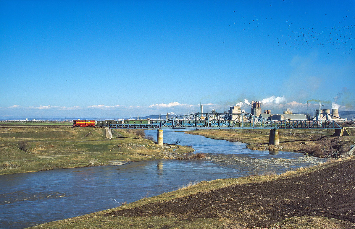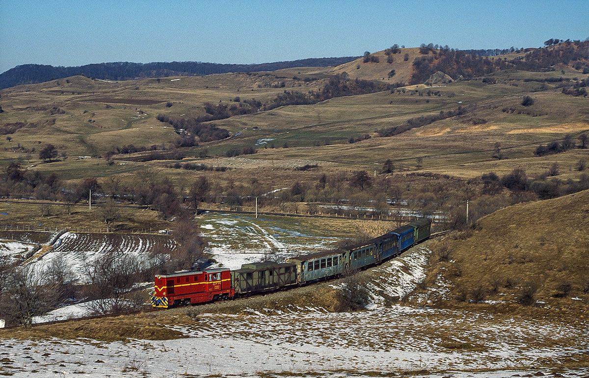 Hinter Eremitu wird mit den Ausläufern des Gurghiu-Gebirges langsam die Schneefallgrenze erreicht. Da die Diesellokomotive nicht über eine Zugheizung verfügt, läuft hinter der Lok ein Heizkesselwagen mit (28.02.1997).Am Haltepunkt Troiţa bereicherte ein schöner Wartburg die Szene (28.02.1997).In Târgu Mureş überquerte am 28. Februar 1997 ein Zug nach Lechinţa die Stahlfachwerkbrücke über den Fluss Mureş. Die Düngemittelfabrik im Hintergrund produziert noch heute.In vielen Orten entlang der Schmalspurstrecke lebte ein größerer Bevölkerungsanteil Roma (28.02.1997).