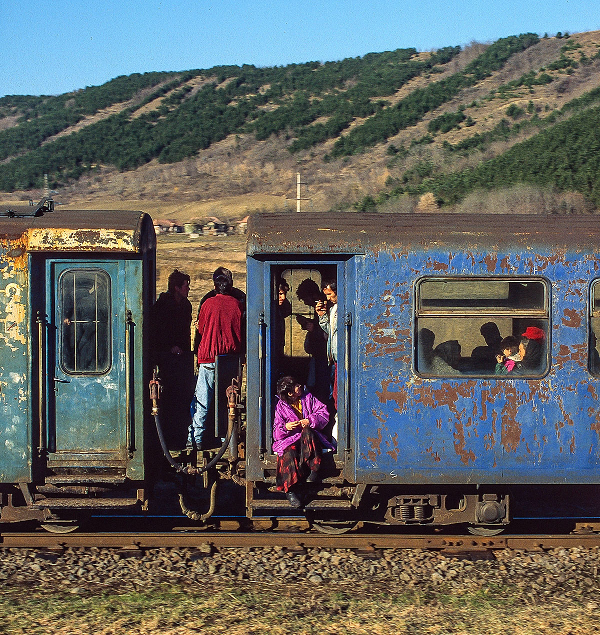 Romasiedlung in Band (28.02.1997).Ein Zug am Bahnübergang mit der Kreisstraße DJ152A in Band (28.02.1997). Man beachte die Fahrgäste außen am Zug!