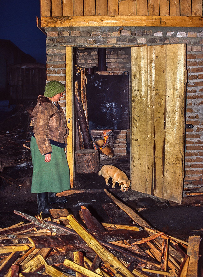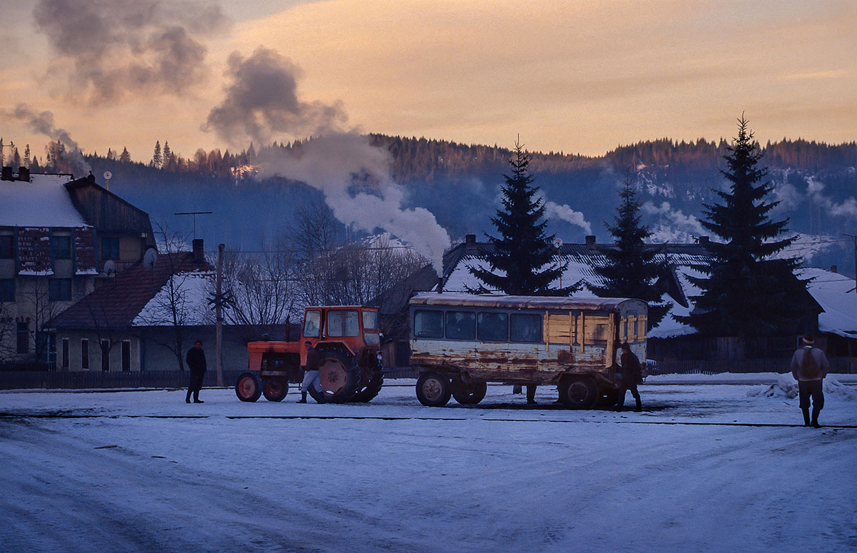 Auf der Fahrt von Tismana nach Covasna machten wir einen kurzen Stopp am Schloss in Bran. Am 24.02.1997 präsentierte sich die darunter vorbeiführende Europastraße 574 noch recht autofrei.In Comandău steht am 25.02.1997 der morgendliche "Werksbus" zur Abfahrt bereit.Diese Frau ist in Comandău für die Aufbereitung von heißem Wasser zuständig, welches für das Kühlwassersystem der Forst-LKWs bestimmt ist (25.02.1997).