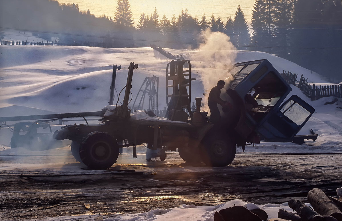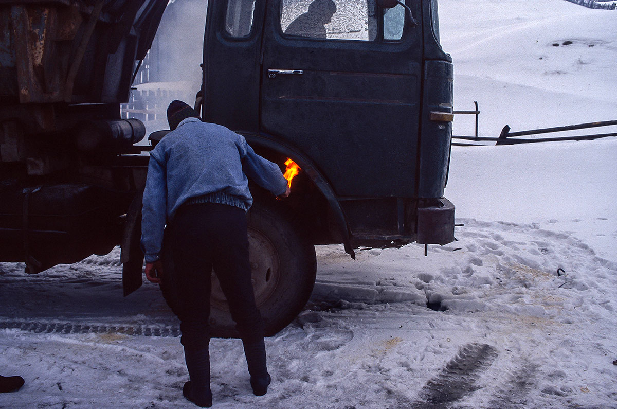 Damit die Lastkraftwagen am frostigen Morgen anspringen, wird heißes Wasser dem Kühlmittelkreislauf zugeführt. Hinter dem Fahrzeug steht ein Schweißtrafo, der die nötige Anlasserspannung bereitstellt (Comandău, 25.02.1997).Während des Anlassens wird die angesaugte Luft mit Feuer vorgewärmt. Wenn der Startvorgang dann geglückt ist, muss der Motor noch ca. 20 Minuten im Standgas gehalten werden, bis er endlich rund läuft und der LKW fahrbereit ist (Comandău, 25.02.1997).