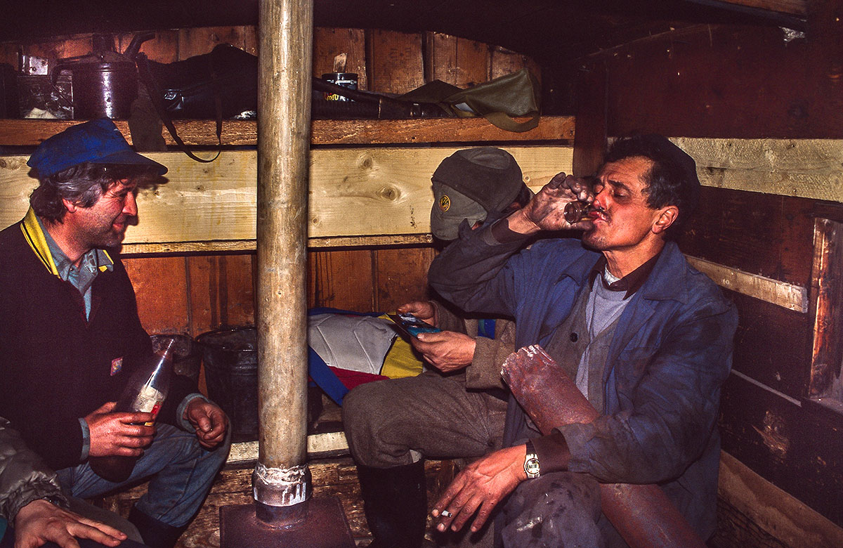 Unverrichteter Dinge ging es am nächsten Tag dann weiter zur Waldbahn Covasna. Übernachtungsmöglichkeit fanden wir bei einer älteren Dame, wo es allerdings keine Dusch- und Bademöglichkeit gab. Aber egal, es war geheizt und für das eine oder andere Schnäpschen wurde auch gesorgt. Sowohl unter- und oberhalb der bekannten Standseilbahn fand Zugverkehr statt. Als Schmankerl waren im Regelspurteil des Sägewerkes Covasna beide werkseigenen Dampflokomotiven im Einsatz. Auf dem oberen Streckenteil fuhren wir zwischen Şiclău und Comandău im Zugbegleitwagen mit. Auch wenn fotografisch kaum etwas herauskam, war es ein unvergessliches Erlebnis. Der Kanonenofen in Wagenmitte heizte wohlige Wärme ein. Und wem das nicht reichte, der durfte (oder genauer gesagt "musste") mit Schnapsrunden seinen Wärmehaushalt aufbessern. Auch der Heizer hielt sich mit Schnapskonsum nicht zurück. Da er aufgrund seiner Verfassung letztlich nicht mehr in der Lage war, mit den Holzscheiten die Feuerbüchse zu treffen, musste er gegen einen weniger alkoholisierten Kollegen ausgetauscht werden. Nachdem im Wagen laut gesungen und auf einem ausrangierten Ofenrohr Gitarre gespielt wurde, kam es noch zum spontanen Abkoppeln des Begleitwagens bei voller Fahrt. Der umsichtige (und glücklicherweise noch nüchterne Lokführer) bemerkte zum Glück diesen Blödsinn. Sonst wären wir irgendwo im verschneiten Winterwald liegengeblieben.